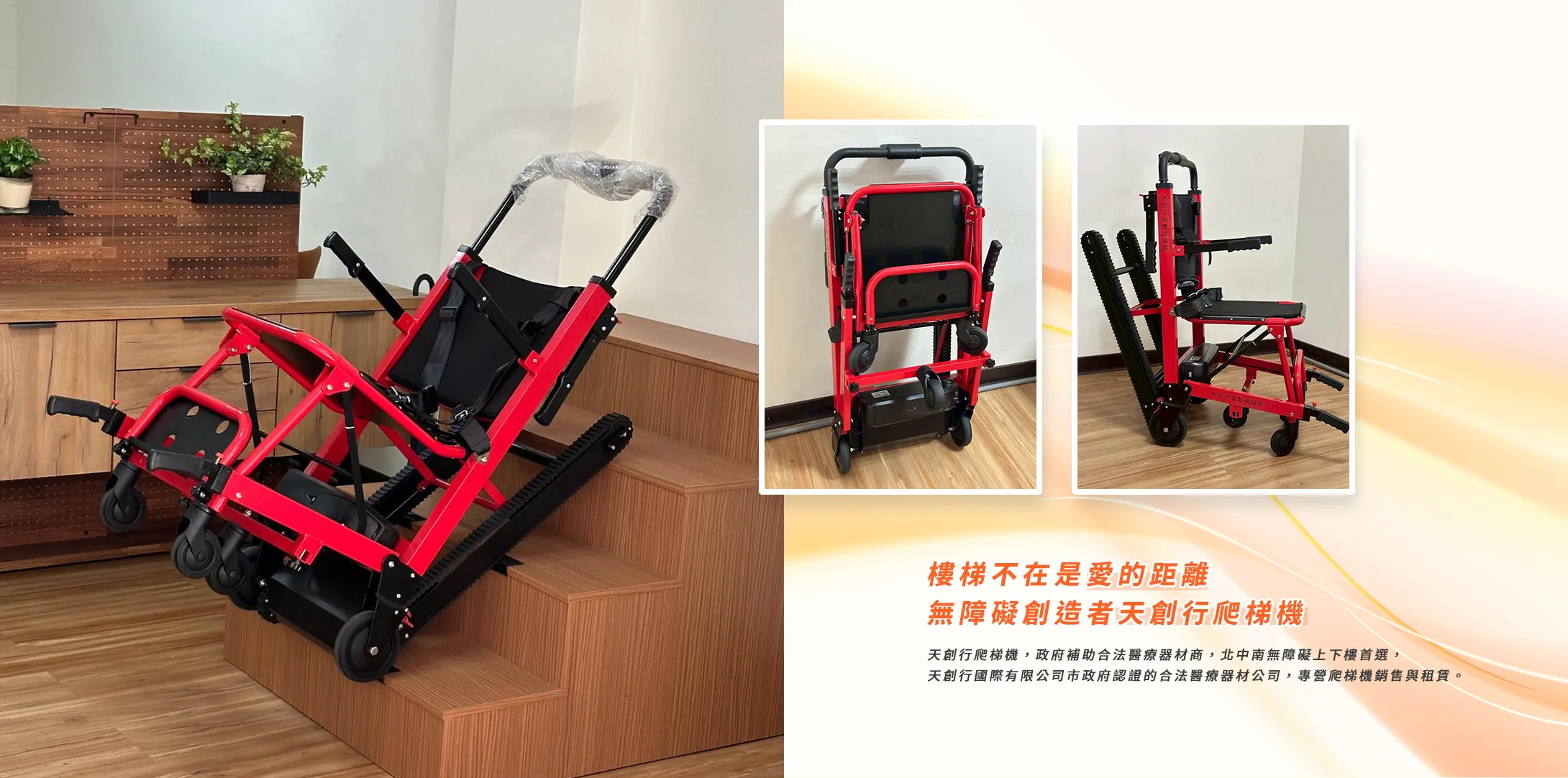 天創行爬梯機為政府社會局長照、身心障礙醫療器材輔具補助特約商、 專營爬梯機銷售、租賃、中古機銷售等業務。